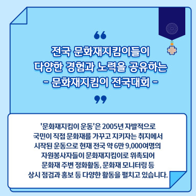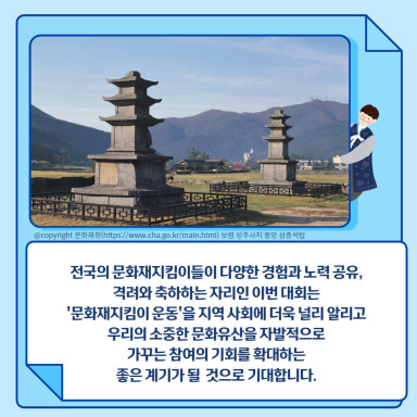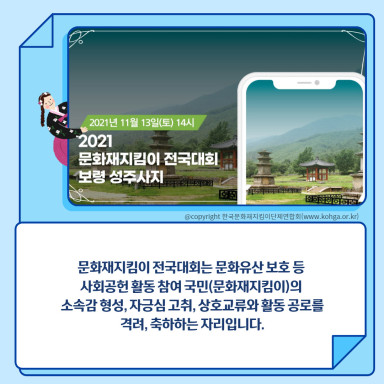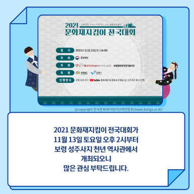 커뮤니티 카드뉴스 제목11월 둘째주 문화재뉴스(문화재지킴이 전국대회)2021-11-09 13:44카테고리연합회 소식작성자 한지연 안녕하세요11월 둘째주 문화재뉴스입니다.2021년도 문화재지킴이 전국대회가이번 주 11월 13일 토요일 충청남도 보령시에서 개최됩니다.많은 관심과 시청 바랍니다.https://www.youtube.com/user/koreanheritage #한국문화재지킴이단체연합회#문화재지킴이#문화재뉴스#전국대회#충청남도#보령시#성주사지 목록 댓글 [0] 댓글작성자(*)비밀번호(*)자동등록방지(자동등록방지 숫자를 입력해 주세요)내용(*) 댓글 등록 더보기이전11월 셋째주 문화재뉴스 한지연 2021-11-16다음11월 첫째주 문화재뉴스 한지연 2021-11-02 Powered by MangBoard | 망보드 스토어