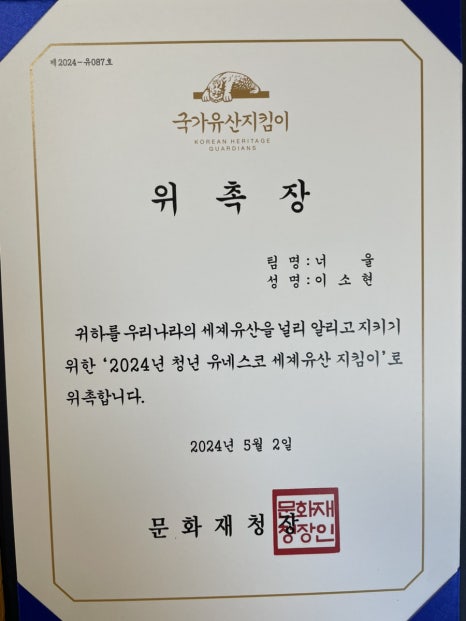 청년 유네스코 세계유산 지킴이란 무엇인지, 어떤의미를 가지고 있는지에 대해서 더 자세히 알고 앞으로 너울이 어떤 자세로 활동에 임해야 할지 생각해볼 수 있던 뜻깊은 시간이었습니다.