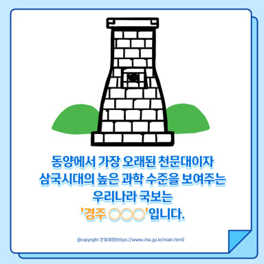 커뮤니티 카드뉴스 제목9월 둘째주 문화재뉴스2021-09-07 16:08카테고리연합회 소식작성자 한지연 정답 : 첨성대#한국문화재지킴이단체연합회#문화재지킴이#문화재뉴스#경주#첨성대#포스팅재배포금지 목록 댓글 [0] 댓글작성자(*)비밀번호(*)자동등록방지(자동등록방지 숫자를 입력해 주세요)내용(*) 댓글 등록 더보기이전9월 셋째주 문화재뉴스 한지연 2021-09-14다음8월 다섯째주 문화재뉴스 한지연 2021-08-31 Powered by MangBoard | 망보드 스토어