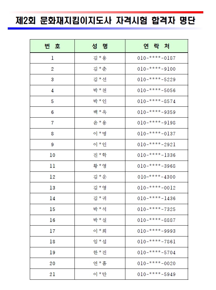 커뮤니티 공지사항 공지사항 공지사항 제목< 제2회 한국문화재지킴이단체연합회 문화재지킴이지도사 자격시험 합격자 공고 >2019-10-14 11:36카테고리공지작성자 한지연 첨부파일2019 문화재지킴이지도사 2회 자격시험 합격자 명단.pdf (50.1KB)끝. #문화재지킴이지도사 목록 댓글 [0] 댓글작성자(*)비밀번호(*)자동등록방지(자동등록방지 숫자를 입력해 주세요)내용(*) 댓글 등록 더보기이전2019 문화재지킴이 전국대회 개최 및 참가 신청 안내 한지연 2019-09-30다음문화재지킴이지도사3기 양성과정 운영 계획 알림 한지연 2019-11-12 Powered by MangBoard | 망보드 스토어